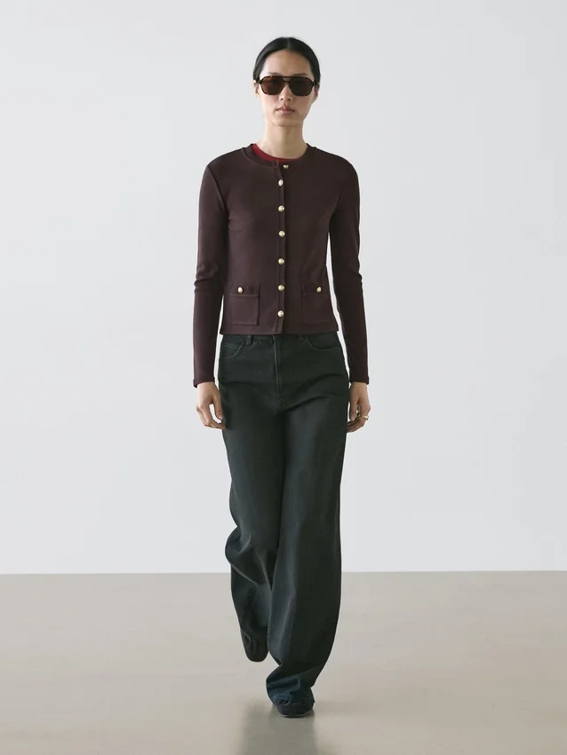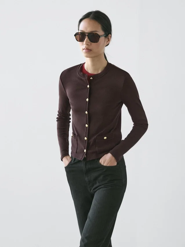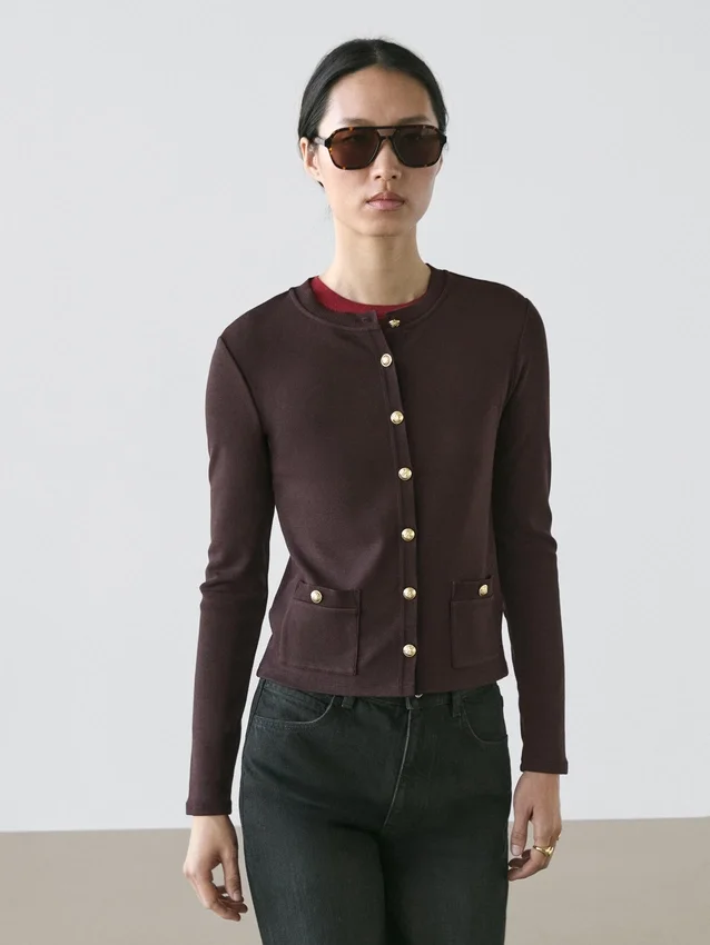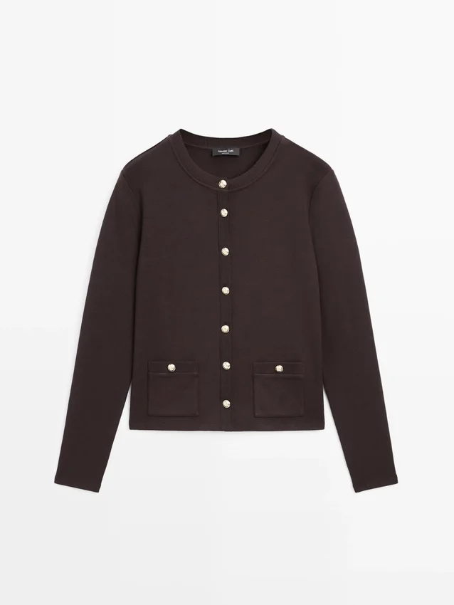 Cardigan. Crew Neck. Long Sleeves. Elegant Gold-Toned Rhinestone Buttons. Two Buttoned Flap Pockets .