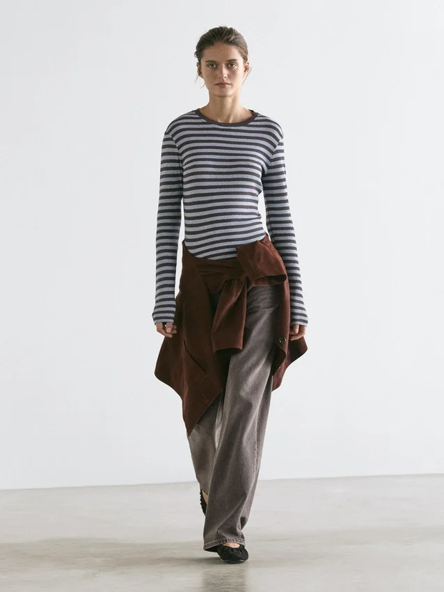Cotton Blend T-Shirt. Crew Neck. Long Sleeves. Striped Print.