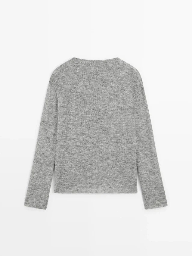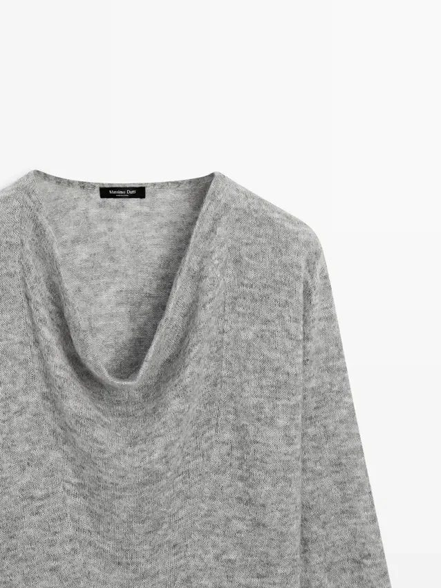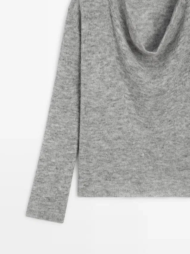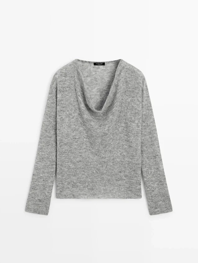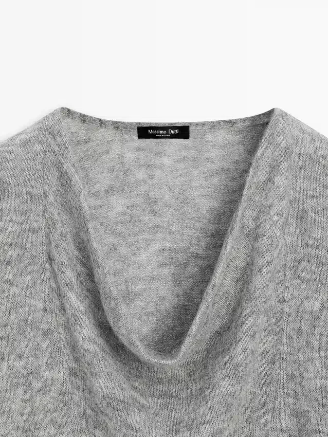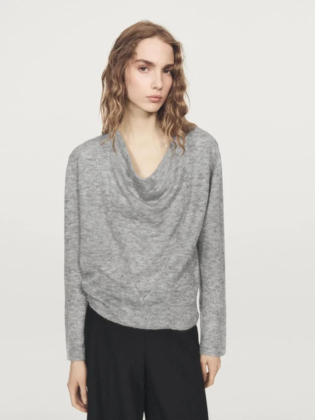Wool Blend Knit Sweater. Draped Collar. Long Sleeves. Wide and Relaxed Silhouette, Not Tailored.