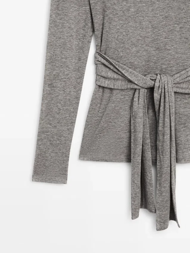 T-Shirt. Crew Neck. Long Sleeves. Tied Bow Detail on the Front.