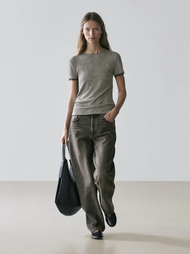 Short Sleeve T-Shirt. Crew Neck. Lace Detail.