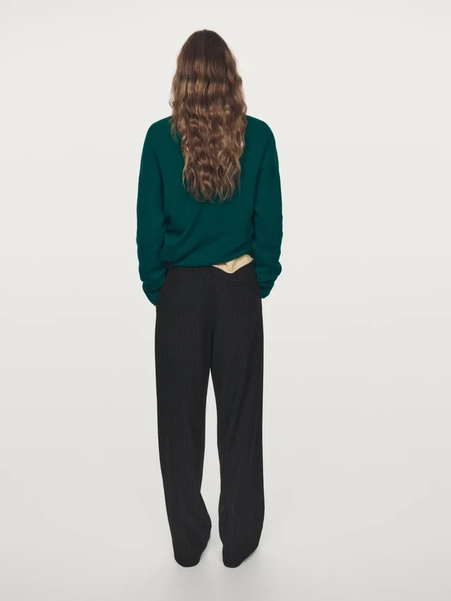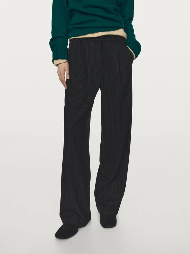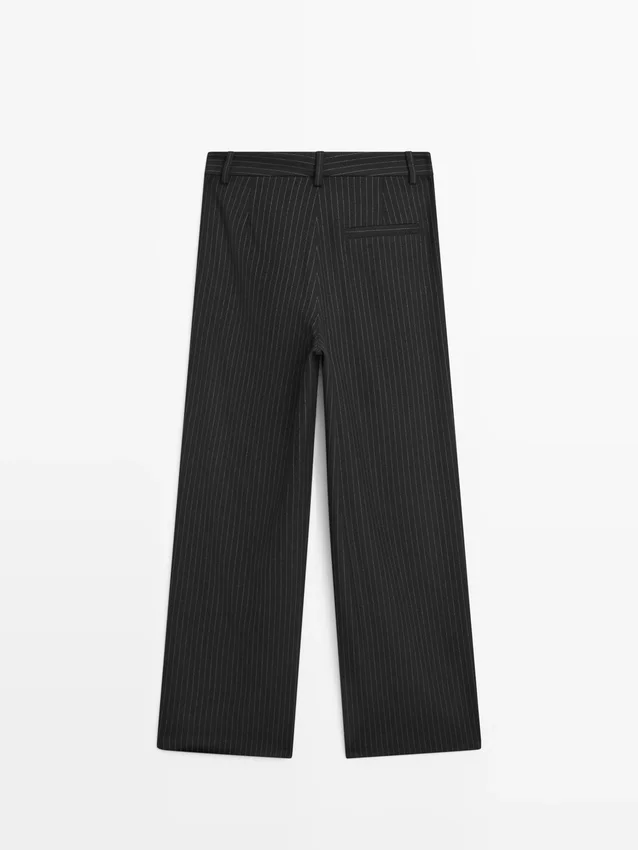 Wide-Leg Trousers. Front Zip and Top Button Fastening. Two Side Pockets. One Welt Pocket at the Back. Pinstriped. Darted Detail on the Front.