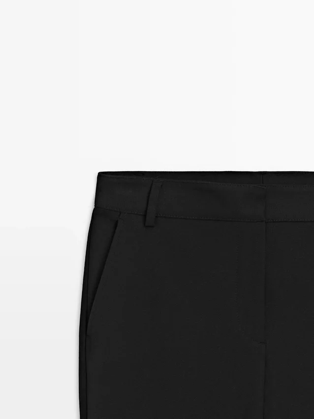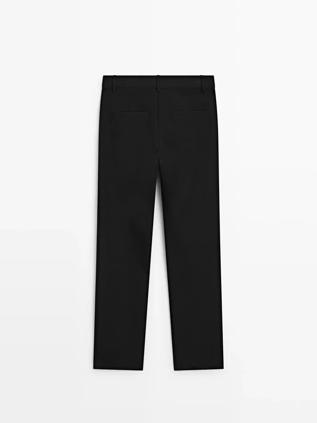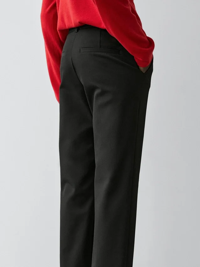 Straight-Leg Trousers Made of Technical Fabric. Zip Fastening Hidden by a Placket, Inside Button . Two Side Pockets. Two Welt Pockets on the Back. Stretch Fabric.