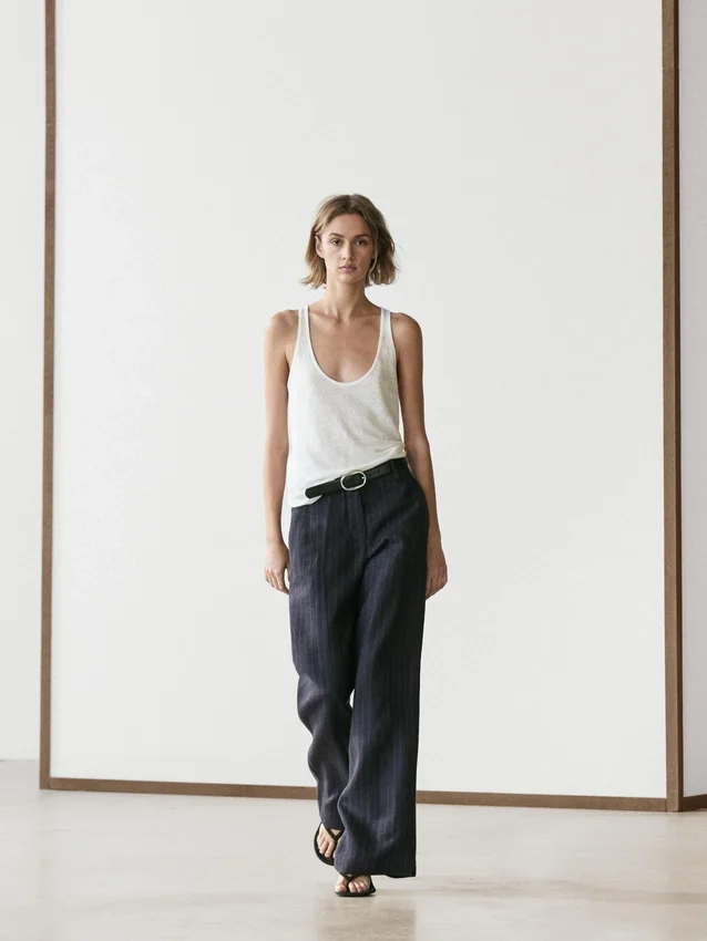 Straight-Leg Trousers Made of 100% Linen Fabric. Waistband with Belt Loops . Front Zip and Concealed Button Fastening. Two Side Pockets. One Welt Pocket at the Back. Pinstriped.