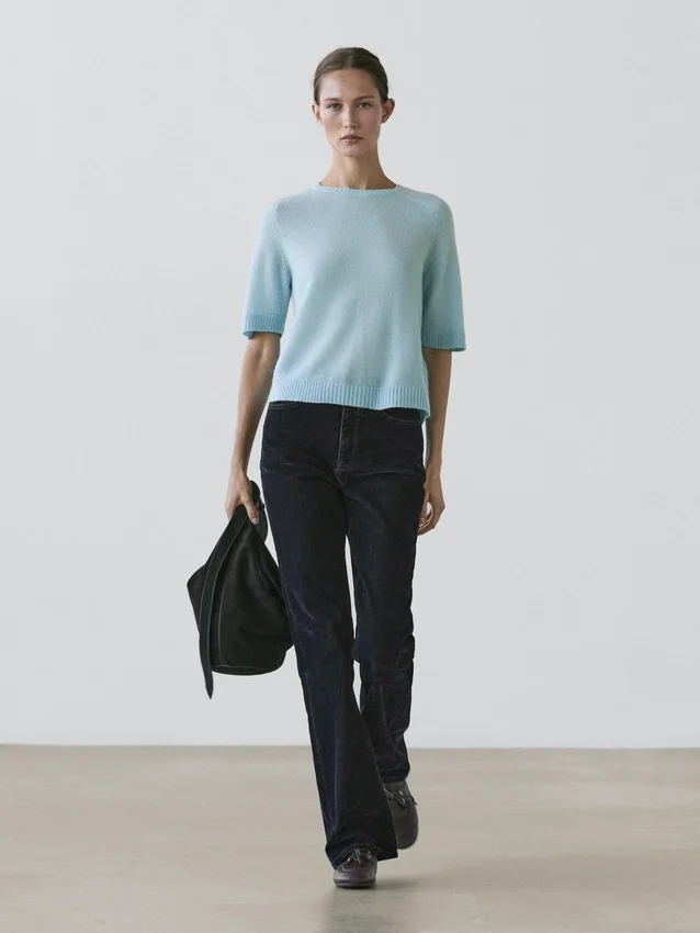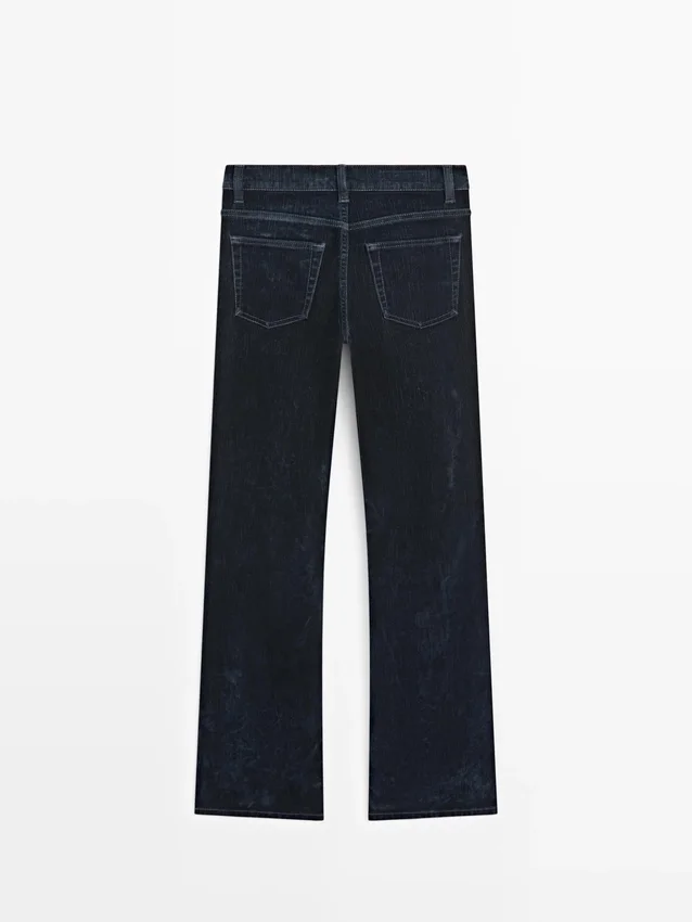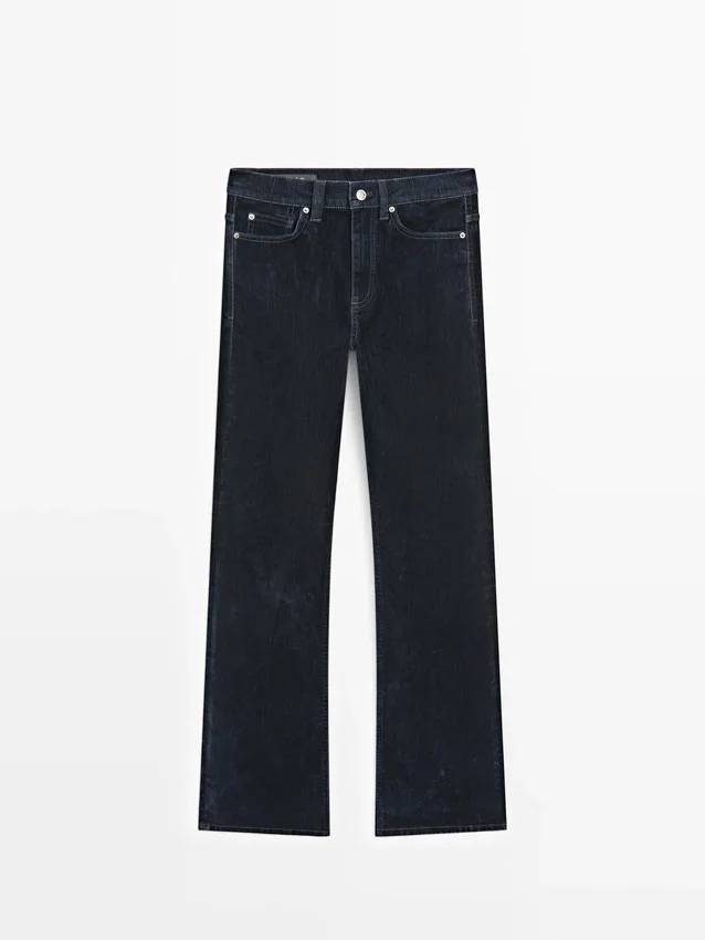 Boot-Cut Jeans: Slim Fit, Fitted at the Waist and Thighs and Loose at the Hem. High-Rise. Front Zip and Top Button Fastening. Five-Pocket Design. Flock Finish, Velvety Effect, Soft to the Touch.