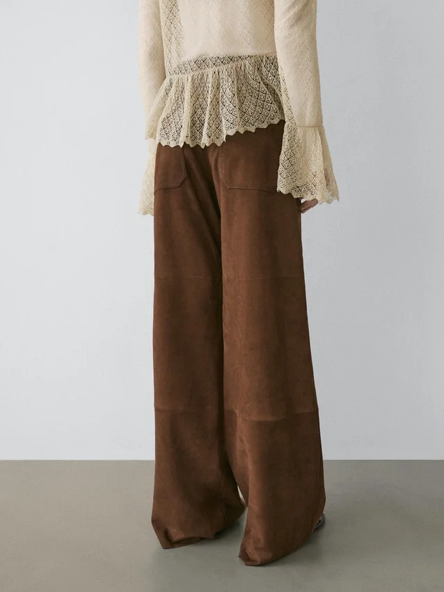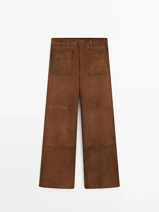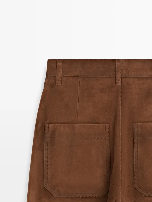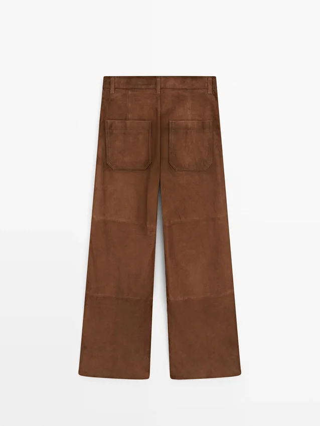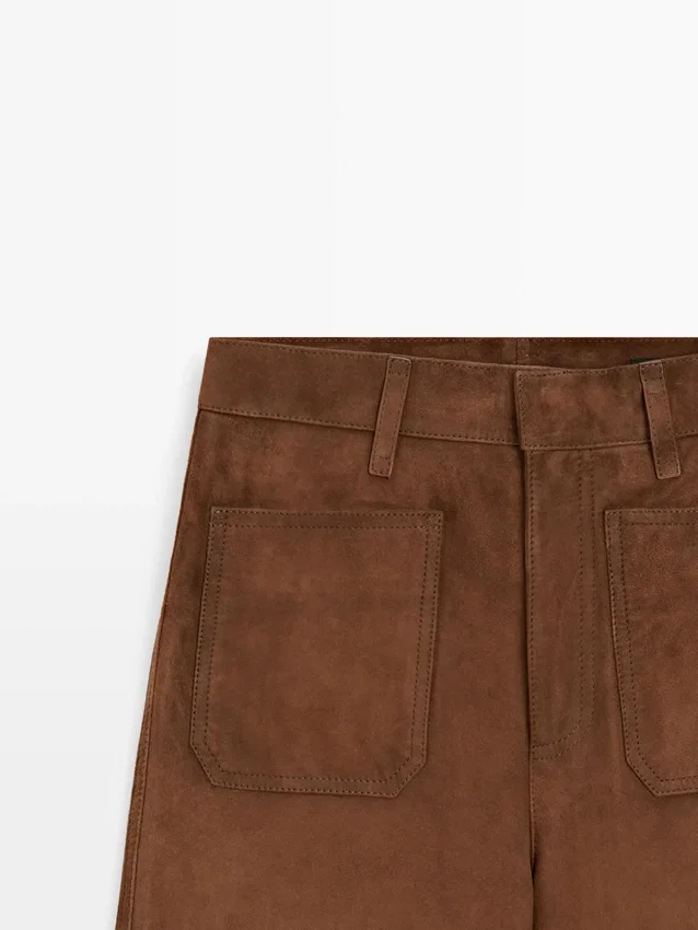 Trousers Made of Goatskin Leather with a Suede Finish. Waistband with Belt Loops . Front Zip and Top Button Fastening. Two Patch Pockets on the Back. Two Patch Pockets. Lined.