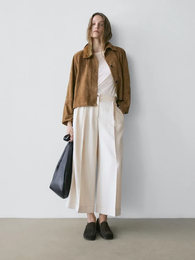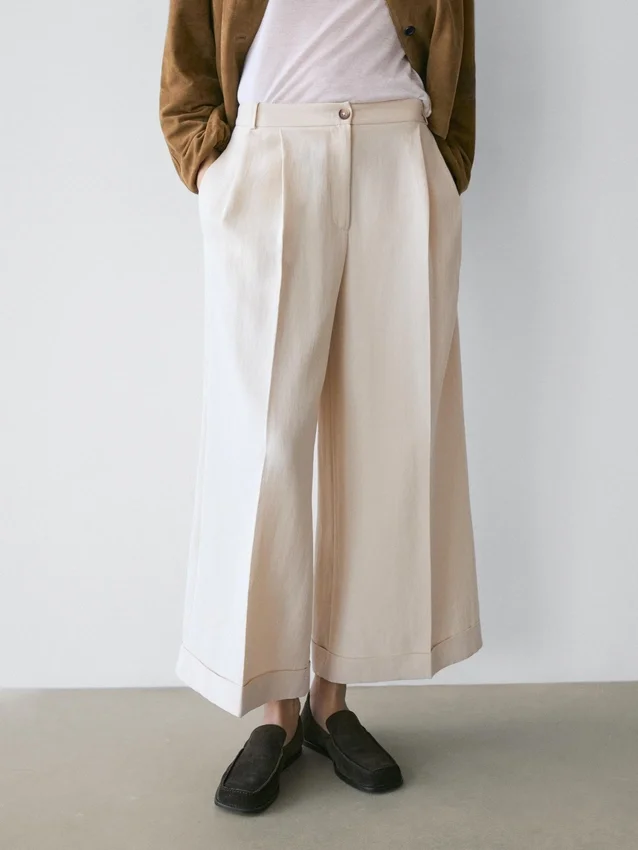 Trousers Made of Flowing Fabric. Waistband with Belt Loops . Front Zip and Top Button Fastening. One Welt Pocket at the Back. Darted Detail on the Front.